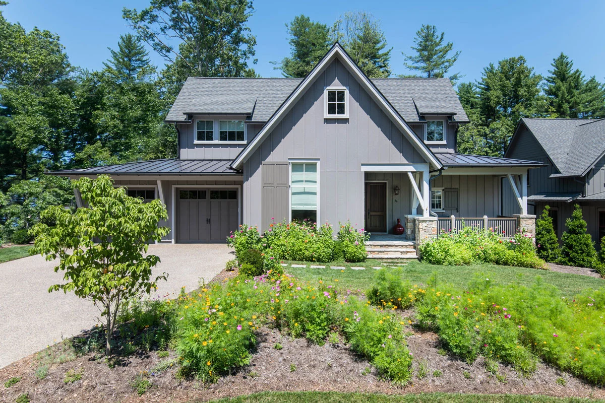 This Ramble cottage is a study in delivering a design that lives bigger than its actual size. The simple and elegant lines of the front elevation take their cues from a more traditional farmhouse design while introducing unique elements that add whimsy reminiscent of English Arts and Crafts such as the swooping large front gable, bracketed porch columns, and a large shuttered front facing window.